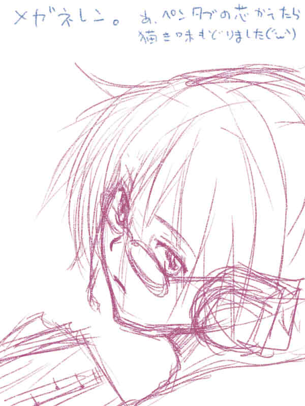 眼鏡レン:最近メガネが好きなようです・・・イラストの中の文は、某SNSで「再インスコしたらSAIの描き味がおかしい・・・」と書いたことに対する解決したよコメです(´・ω・`)綿棒の芯は描きやすいけどすぐダメになるな・・・筆圧強すぎる私orz